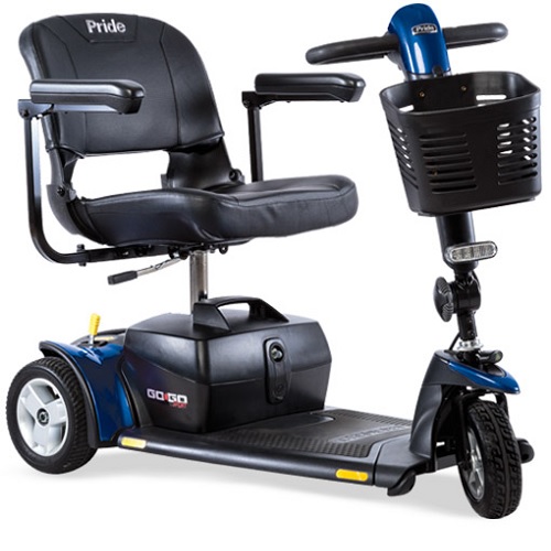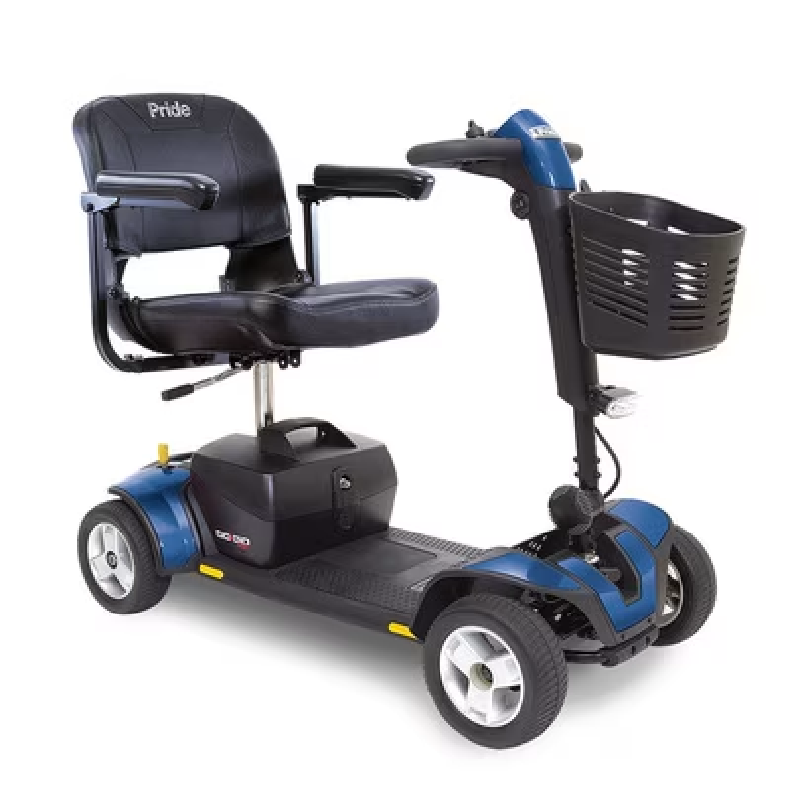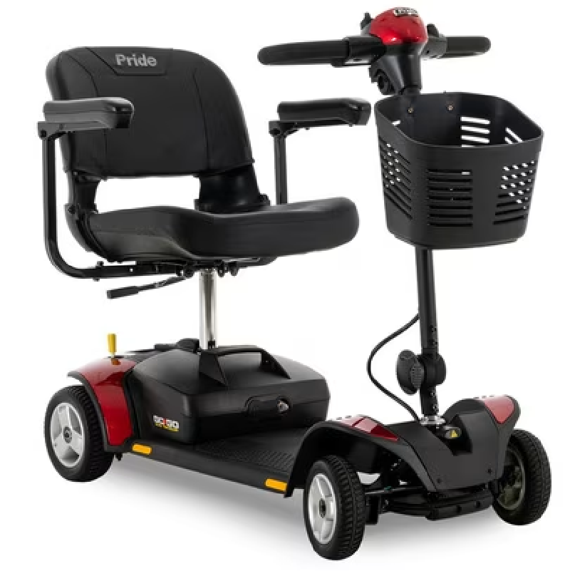 Our rental fleet of sturdy Go go Sport 4-wheel scooters from Pride Mobility combines the convenience of a travel scooter with the performance and comfort typically found in full-size models supporting up to 325 pounds. The scooter is designed for easy transportation, featuring a simple feather-touch, disassembly that allows it to break down into five lightweight pieces.